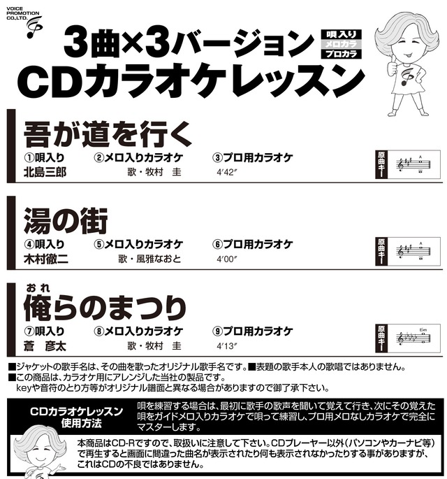 【発売日】 2026年1月25日 【商品内容】 ・音声多重 スライド映像と歌詞が出る ・カラオケ模範歌唱(オリジナル歌手本人の歌唱ではありません) ・フルコーラス譜面、歌詞ブック付 ・6曲+歌唱指導1曲入 【収録曲】 ① 吾が道を行く 北島三郎/唄・牧村圭 ② 男の無情 黒川真一朗/唄・六本木ヒロシ ③ ほろほろヤマドリ 青山 新/唄・牧村圭 ④ 俺(おれ)らのまつり 蒼 彦太/唄・牧村圭 ⑤ 湯の街 木村徹二/唄・風雅なおと ⑥ みちのく流れ唄 木原たけし/唄・牧村圭 【特別レッスン】《講師:高橋春美》 ⑦ 吾が道を行く 北島三郎/唄・牧村圭