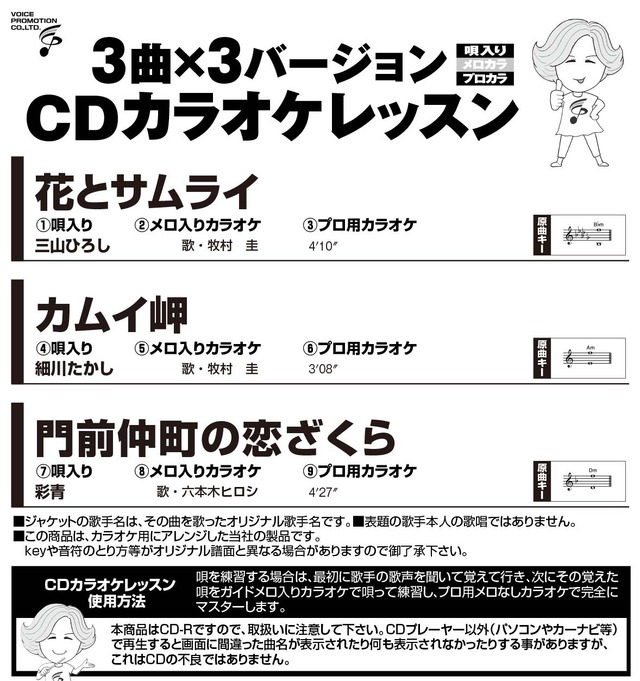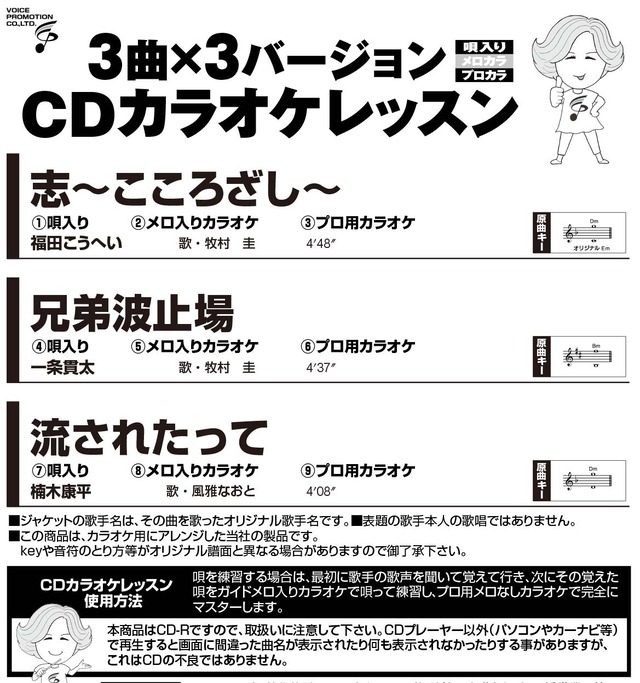 【発売日】 2025年12月20日 【商品内容】 ・音声多重 スライド映像と歌詞が出る ・カラオケ模範歌唱(オリジナル歌手本人の歌唱ではありません) ・フルコーラス譜面、歌詞ブック付 ・6曲+歌唱指導1曲入 【収録曲】 ① 泣いて…長崎 角川博/唄・牧村圭 ② 愛が泣く 日本海 松原健之/唄・風雅なおと ③ 氷花(ひょうか) 走裕介/唄・牧村圭 ④ 小樽北運河 弦哲也/唄・牧村圭 ⑤ 十六夜橋(いざよいばし) こおり健太/唄・六本木ヒロシ ⑥ 坂本龍馬~日本の夜明けの夢を見る~ 秋岡秀治/唄・牧村圭 【特別レッスン】《講師:高橋春美》 ⑦ 泣いて…長崎 角川博/唄・牧村圭