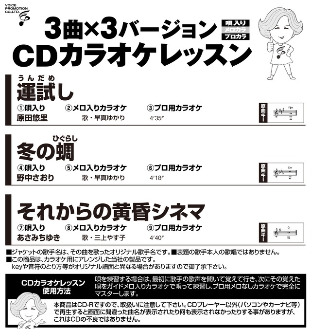 【発売日】 2026年1月25日 【商品内容】 ・音声多重 スライド映像と歌詞が出る ・カラオケ模範歌唱(オリジナル歌手本人の歌唱ではありません) ・フルコーラス譜面、歌詞ブック付 ・6曲+歌唱指導1曲入 【収録曲】 ① 運試(うんだめ)し 原田悠里/唄・早真ゆかり ② 焼肴(やきざかな) 北原ミレイ/唄・秋山詩織 ③ 二人傘 瀬口侑希/唄・早真ゆかり ④ 冬の蜩(ひぐらし) 野中さおり/唄・早真ゆかり ⑤ それからの黄昏シネマ あさみちゆき/唄・三上やす子 ⑥ 秘恋抄(ひれんしょう) 塩乃華織/唄・三上やす子 【特別レッスン】《講師:高橋春美》 ⑦ 運試(うんだめ)し 原田悠里/唄・早真ゆかり