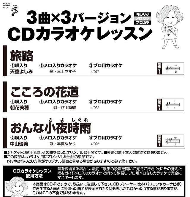 【発売日】 2026年2月20日 ※既に発売中の商品と一緒にご購入の場合、既発商品もまとめて2月20日前後のお届けとなります。 【商品内容】 ・音声多重 スライド映像と歌詞が出る ・カラオケ模範歌唱(オリジナル歌手本人の歌唱ではありません) ・フルコーラス譜面、歌詞ブック付 ・6曲+歌唱指導1曲入 【収録曲】 ① 旅路 天童よしみ/唄・三上やす子 ② 暖流桜 川中美幸/唄・三上やす子 ③ こころの花道 朝花美穂/唄・秋山詩織 ④ かごめかごめ 小桜舞子/唄・Sheena ⑤ おんな小夜時雨(さよしぐれ) 中山琉美 /唄・早真ゆかり ⑥ お湯割りで 羽山みずき/唄・早真ゆかり 【特別レッスン】《講師:高橋春美》 ⑦ 旅路 天童よしみ/唄・三上やす子