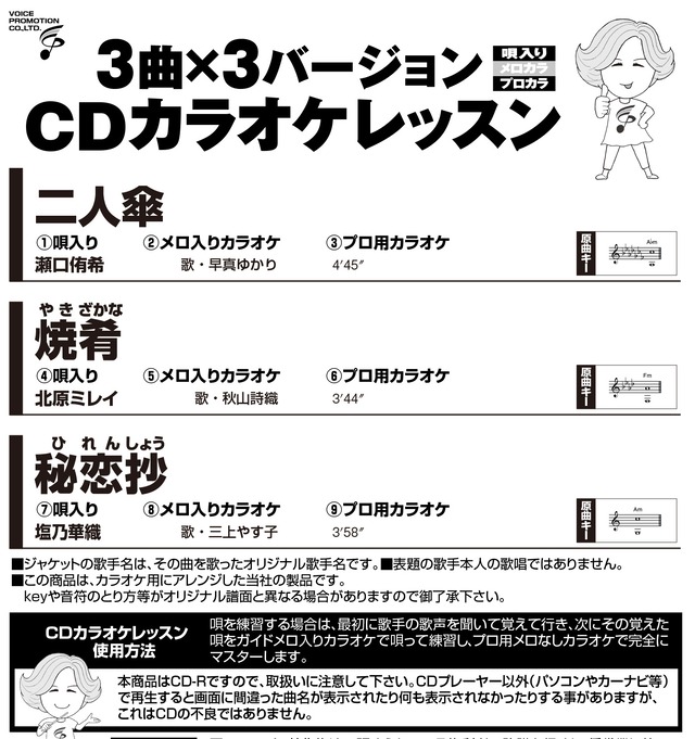 【発売日】 2026年1月15日 【商品内容】 ・フルコーラス譜面・歌詞 ・3曲x3バージョン(歌入り/メロカラ/プロカラ) 【収録曲】 ① 二人傘 瀬口侑希/唄・早真ゆかり ② 焼肴(やきざかな) 北原ミレイ/唄・秋山詩織 ③ 秘恋抄(ひれんしょう) 塩乃華織/唄・三上やす子 ※こちらの商品はCDです。映像は出ません。 ※オリジナル歌手本人の歌唱ではありません。 ※本商品はCD-RですのでCDプレーヤー以外(パソコンやカーナビ等)で再生すると画面に間違った曲名が表示されたり、何も表示されなかったりする事がありますが、CDの不良ではありません。