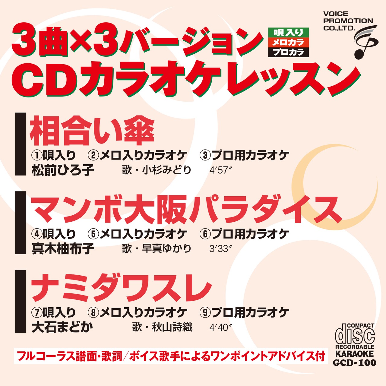 CDカラオケレッスン100、カラオケ初心者でも簡単に歌うことができる生演奏の音源を収録したカラオケCDです。専門家が作成したCDなので、自己流で歌ってしまう心配もありません。