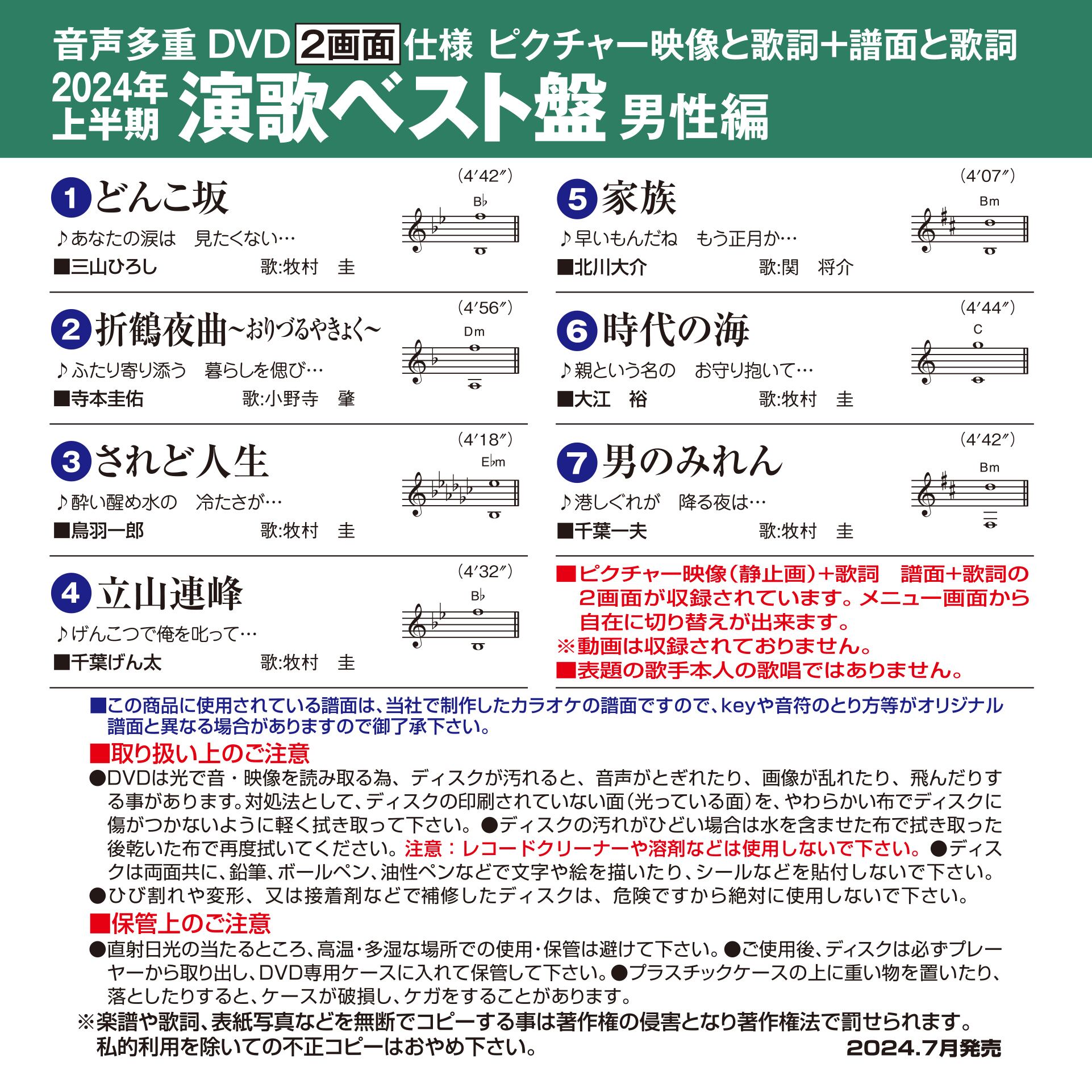 『音声多重DVD 2024年上半期 演歌ベスト盤 男性編』に収録されている楽曲は、2024年上半期に当社カラオケで人気のあった男性演歌曲の中から、カラオケ好きならぜひ押さえておきたい厳選された7曲をセレクト。